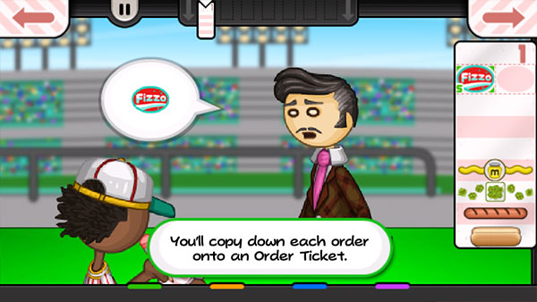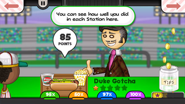 在游戏的世界观设定里,老爹热狗店乃是老爹路易旗下的第7家餐厅,其开设地点处在美味城中的烤炉体育场。这家店的员工是泰勒(男性)和佩吉(女性),所贩售的食品有热狗、汽水以及爆米花。烤炉体育场主要供来自各地的棒球队与曲棍球队进行比赛,而且玩家还能够在 “Home Run Derby” 这个小游戏中感受一下打棒球的乐趣。