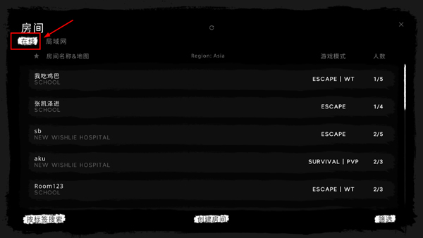 2、接着点击“在线”,玩家能够挑选好友或其他玩家创建的房间并进入。