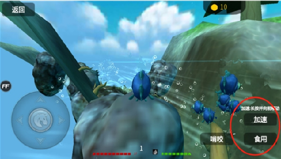 4、可以寻觅一处地方隐匿起来,静候鱼类游过,待其靠近时,点击加速,迅猛冲上前去将其吃掉。
