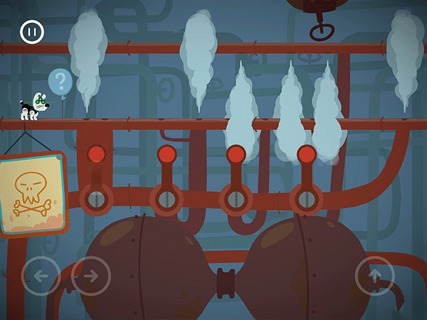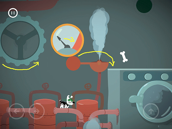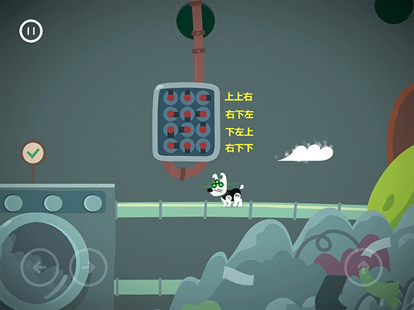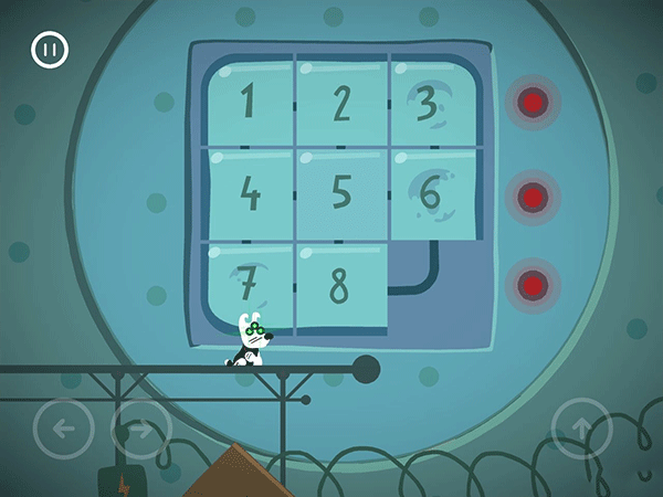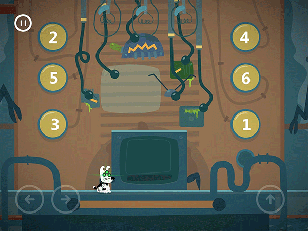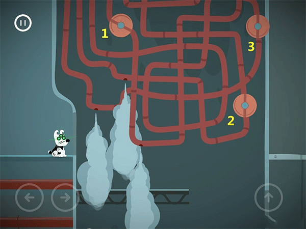 当这边按下左边的黄色按钮,右边的门便开始计时下落。需先将这块板从右往左调整至最低位置,随后就能吃完灯泡和骨头,顺利通过闸门。一定要保持镇定,切勿慌张。