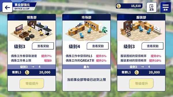 我优先升级的部门是市场部,从页面上能看到,它的级别越高,在工作中触发great的概率就越大,获得的金币也越多。要知道,金币可是购买家具以及升级事业部的关键工具,要是想布置房间却没有金币,那可就没办法了!