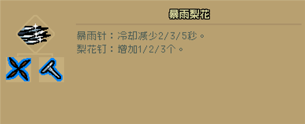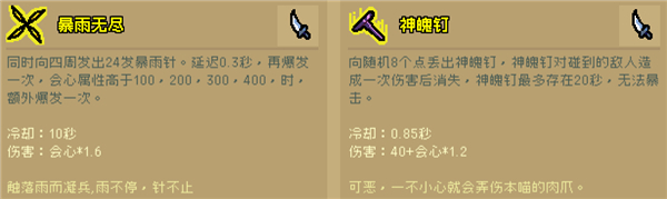 升级学习减少物理技能冷却时间(cd),如此一来,每次攒满梨花钉后一次性消耗,最高可获得2000左右的属性加成。到游戏后期,角色的会心属性甚至能够突破10000,暴雨针单次攻击伤害可达100万。具体详情请查看下图: