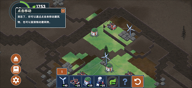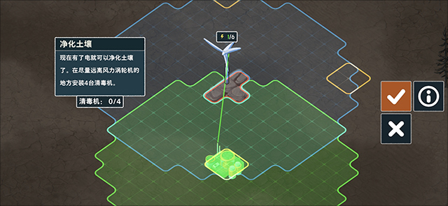 5、进入可操作界面后先是需要玩家建立风力涡轮机,在移动到合适位置后(呈现绿色后)就可以点击“√”键建立了;
