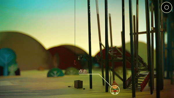 5、刚踏入城市,便遭遇首个关卡。卢米若想从当前位置上去,就只能借助吊钩。先捡起前方地面上的小木棍,放入背包,接着打开背包,将木棍拖至铃铛处,敲响铃铛,如此一来,上面的人便会把你吊上去。