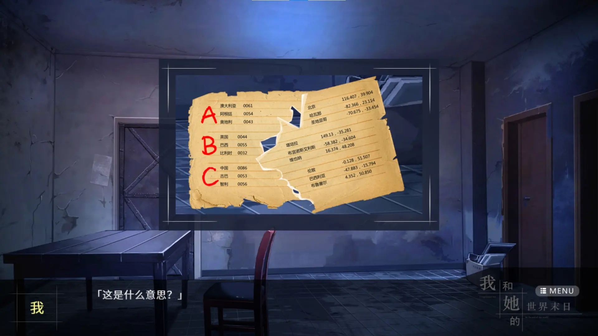 《我和她的世界末日》(英文名为Our End of the World ),是一款冒险解谜类GALGAME游戏,由橘子班负责制作,NVLMaker负责发行。该游戏在2017年11月3日正式发行,首发平台为PC ,之后还推出了手机版本。游戏的背景设定在世界末日来临之时,地面世界已被摧毁,人类近乎灭绝,仅剩下主角与女主角二人存活。玩家要扮演主角,在保护女主角的过程中,解决生存难题,同时探寻世界毁灭背后的真相。