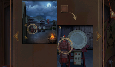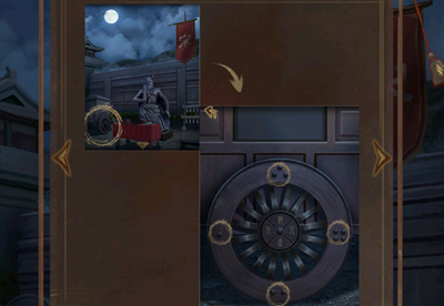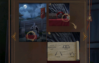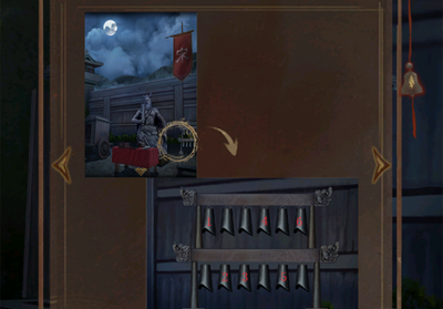 上、下、下、上、下、上敲击编钟,雕像另外一只眼睛会亮起,并且获得军旗,来到三面鼓这里,将军旗给士兵。
