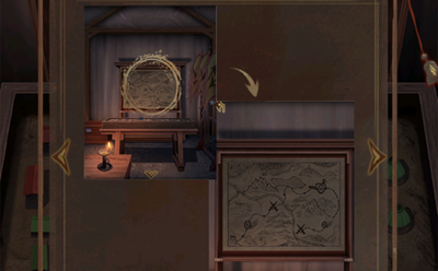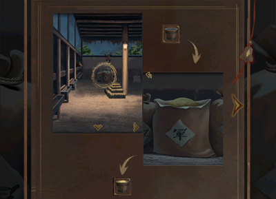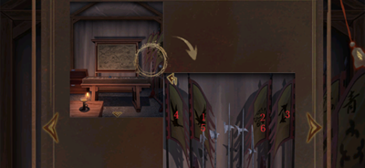 17、进入右边的指挥营帐,点击场景沙盘上的军礼记第一页,查看线索得知行军兽旗对应为: