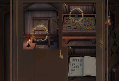 2、点击场景木桌桌面,拾取道具:百草录,可以查看到每种药材对应的形状,以及被红圈圈起来代表所需要的药材。