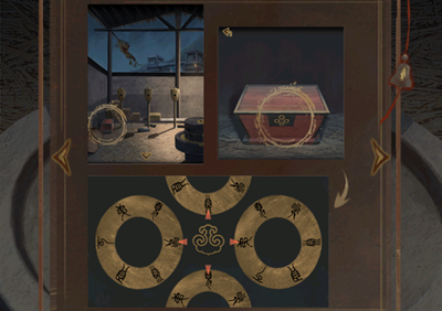 28、用谷粉喂马,待马低下头时,留意墙壁上的线索。点击场景左侧墙根处的木箱,依照马背后墙上的图案,像图中展示的那样去调整转盘,进而打开木箱。