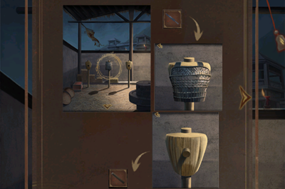 14、在场景里点击铜漏,把一桶水倒进铜漏后安装好木刻尺,接着通过点击上方的进水口与下方的出水口,将刻度尺调节至卯时刻度。