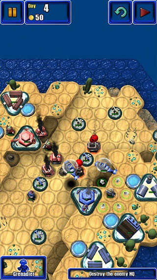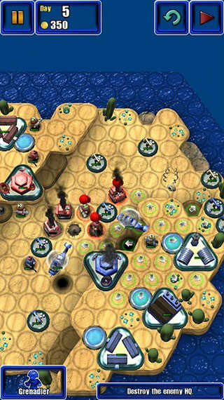 5、第五天,敌方没什么钱出兵了,敌人也基本残血,手雷兵和直升机随意收割,出炮兵或轰炸机炸掉总部。
