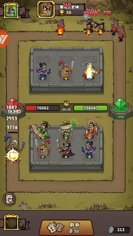 真人竞技,3秒急速匹配!玩家可选派10名武将出战,战中可以根据对手阵容调整应对策略,战中获得银币还可合成神级武将!