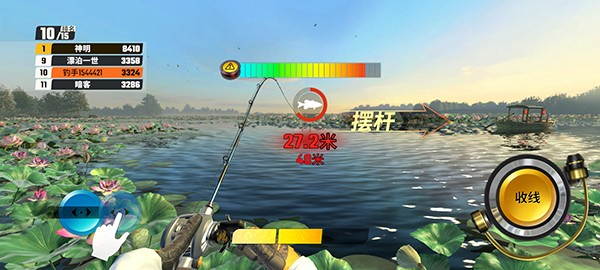 3、接着双手握住手机,往前一抛,就能够实现甩杆钓鱼了,完全不需要长按屏幕抛出鱼竿。