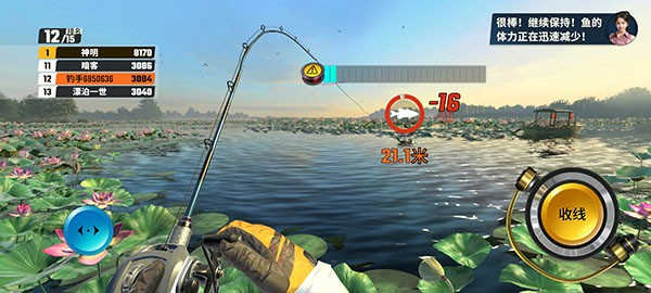 5、鱼儿上钩后我们需要合理的点击收线,当鱼力竭后即可成功钓到;