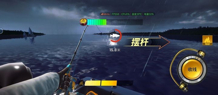 鱼在收线的过程中,会比较紧张,从而左右极速游动,我们可以通过屏幕左侧的摆竿按钮,进行左右滑动,同时每完成一次摆竿,填充一次屏幕下方的爆气值。