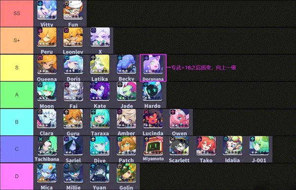 奈奈在专武16级前后,简直就像两个不同的角色。强烈建议大家在开服时,优先将她的专武提升至+16 ,如此才能解锁她的完全形态——开局就能满能量,进而直接释放大招。奈奈的关键所在,便是她大招所召唤出的噜噜——一只体型庞大的猫。这只大猫能够继承奈奈的所有属性,战斗力堪称惊人。专武16级后,大猫出场时可造成群体击飞效果,而其被动技能还能实现单体击飞以及瞬移至敌方后排。噜噜被召唤出来后,就如同场上多了一位既抗揍又能承担伤害的重装战士。通过巧妙运用卡位等角色摆放技巧,既可以让大猫充当队伍前排承受伤害,也能够将其当作刺客,单独切入敌方的核心输出位置。另外,奈奈本身属于暗系角色,在补充队伍羁绊方面十分便利。