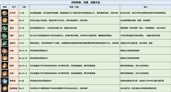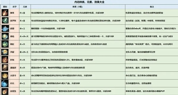 下图为我整理出的内功图鉴大全,效果,元素,类型,一目了然。