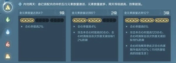 ② 蕴含元素:通过元素数量来获得内功周天效果,元素数量越多,周天效果越好。每个内功的元素是固定的,获取内功后可以看到每个内功之后会生成哪些元素。