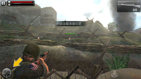 3、拖动手指瞄准目标,点击开火进行射击。