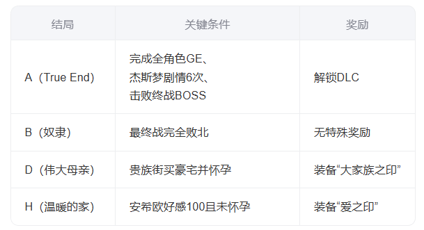 其他结局(C/E/F/G等)涉及魔消煌玉获取、怀孕事件或缇娜剧情分支。