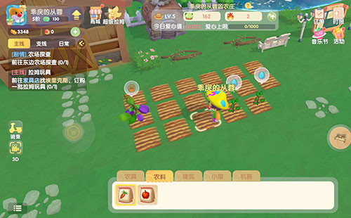 随后可以看到地上出现植物,之后对其浇水,就是点击工具里面的“水壶”即可浇水。随后等待成长,如果你觉得时间太长的话,可以使用肥料,这样能缩短种地的时间;