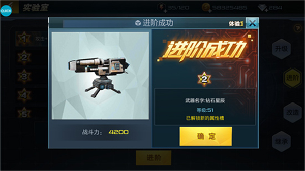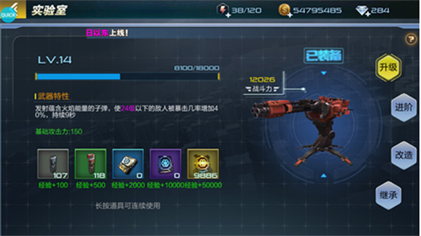 2、当获得了新的超级武器之后,可以使用继承此项功能,将以前的超级武器经验以及开的属性条继承到新的超级武器当中,让玩家可以更快的体验到新型超级武器的快感!