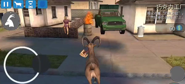 拿到巧克力面包后,系统提示我们用火燃烧面包。马路对面有个油桶已经被点着了,我们穿过马路走到油桶前。面包被卷在山羊的舌头上,够不到火源。我们尝试多晃动几下,或者是可以让山羊在油桶前跳几下,这样面包就会随着上下摆动。多操作几次,巧克力面包就可以碰到火源,然后就燃烧起来了!