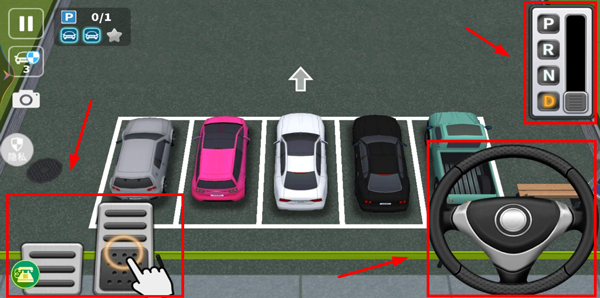 2. 车辆操控:在界面右上角进行挂挡操作,左下角是油门与刹车控制区域,右下角为方向盘操控处。