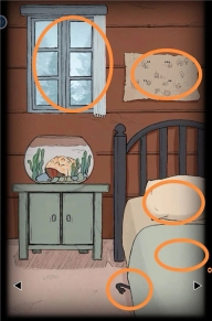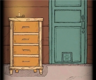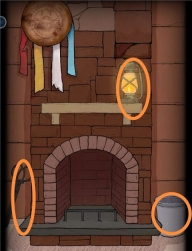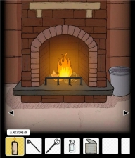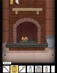 把木雕船丢进烟囱里,接着把煤油提灯也扔进去并生起火来。通过蜡烛接触火光,获得正在燃烧的蜡烛。把火钳放到火堆中,得到床旁柜子右侧门的钥匙,用钥匙打开柜子,拿到旋钮。