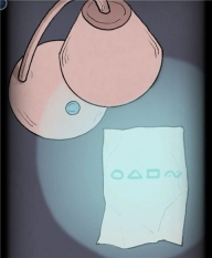 把白纸置于台灯下方,轻按开关,将灯光切换为蓝色,此时白纸上会显现出四个图案。参照旁边两个盆栽上的四个图案,就能得出下方柜子左侧门的四个密码数字8783 。