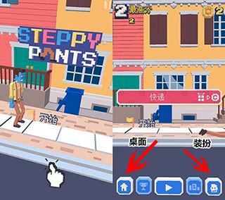 4、当我们进入长腿漫步后,便会即刻开启一轮游戏。在此过程中,我们既能够直接结束游戏,也可以先进行一波挑战,直至本局游戏结束。此时,屏幕下方会出现菜单栏,菜单栏最左边对应的是游戏桌面,右边则是装扮选项。