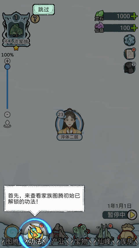 4. 家族图腾初始解锁的功法为元类的《镜元诀》,家族成员能够据此修炼,每月会自动提升修为。