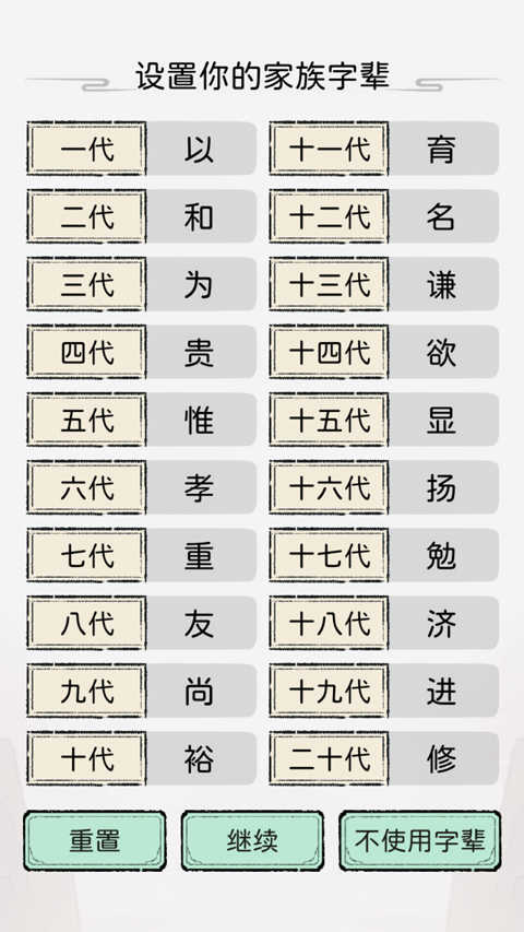 2.接着选择家族字辈,有二十代可以选择;