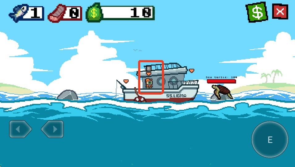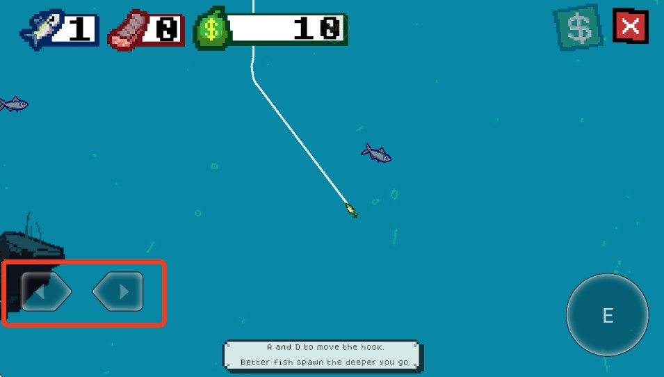 2、使用右下角的按键来控制鱼钩的方向。用鱼钩撞击一条鱼,对它造成伤害,伤害足够后将它钓上来。