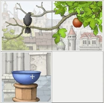 这关的通关方式是把左上角的乌鸦踢下来,接着将右上角的苹果弄进碗里。两者衔接起来,就能触发。随后引导孩子向前走,调整整个门洞的位置,使他进入花园。