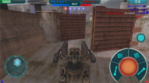 4、游戏里机甲操作相当简单,方向移动和多数射击游戏无异,依靠屏幕左下角的方向按钮就能控制前进、后退以及左右移动。屏幕右边是发射子弹按钮,分左手武器和右手武器,只要一直按住发射按钮,子弹就会持续发射,移动按住发射按钮的手指,就能改变准星位置。武器子弹打完后,换弹夹时间大概九秒,因此务必双手都装备武器,不然武器没子弹时就只能被动挨打了。接下来给大家讲讲机甲和武器的种类划分。