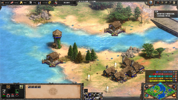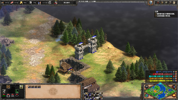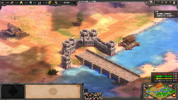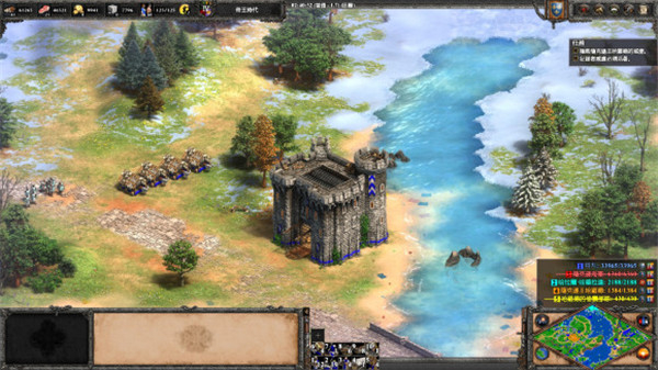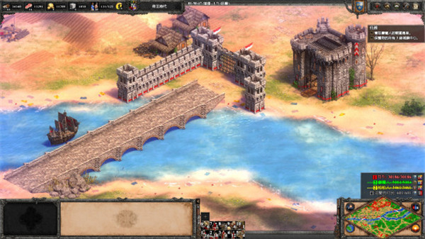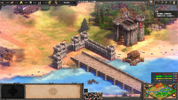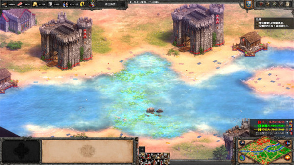 3、 修筑城墙将三座桥封堵住,接着升级到城堡时代,于9点位置的浅滩建造两座城堡。经过一段时间的发展后,便能够展开反攻。 那两个敌人的守军数量都不多,进入城堡时代后,就可以消灭迦菲奇,随后拿下摩尔人的阵地,把车带出来,送回己方区域就能通关。