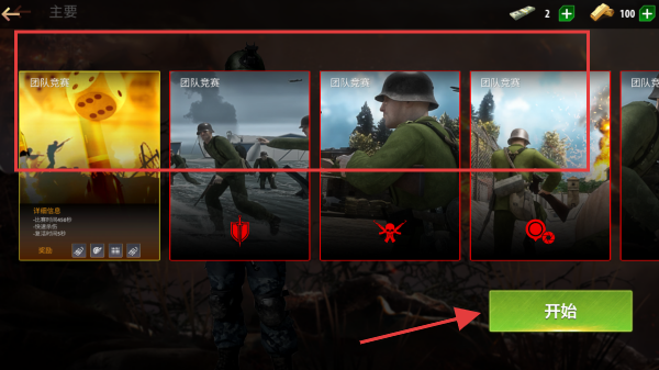 2、在关卡选择界面,选择红色方框内的关卡,点击开始按钮,进入该关卡进行游戏挑战,体验不同的战斗任务内容。