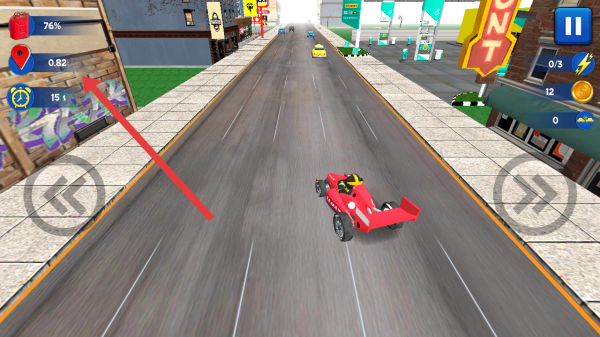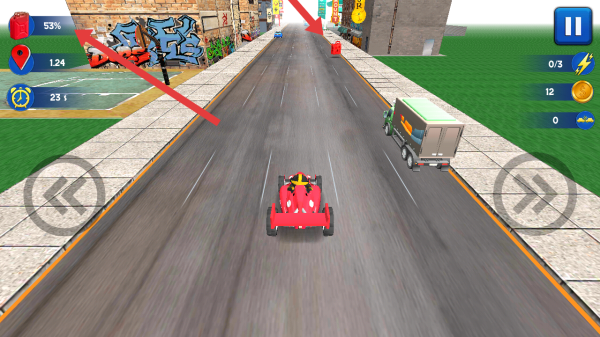 3、需要优先拾取道路上的红色油桶补充燃油如从76%到53%需补给,要小心避让其他的车辆。