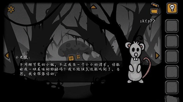 游戏开始后,女主向左侧移动,会发现一座造型奇特的蘑菇小屋。进入其中并返回家中,途中会遇到一只小老鼠,与其对话即可,选项不影响后续流程,继续前进便可推进剧情。