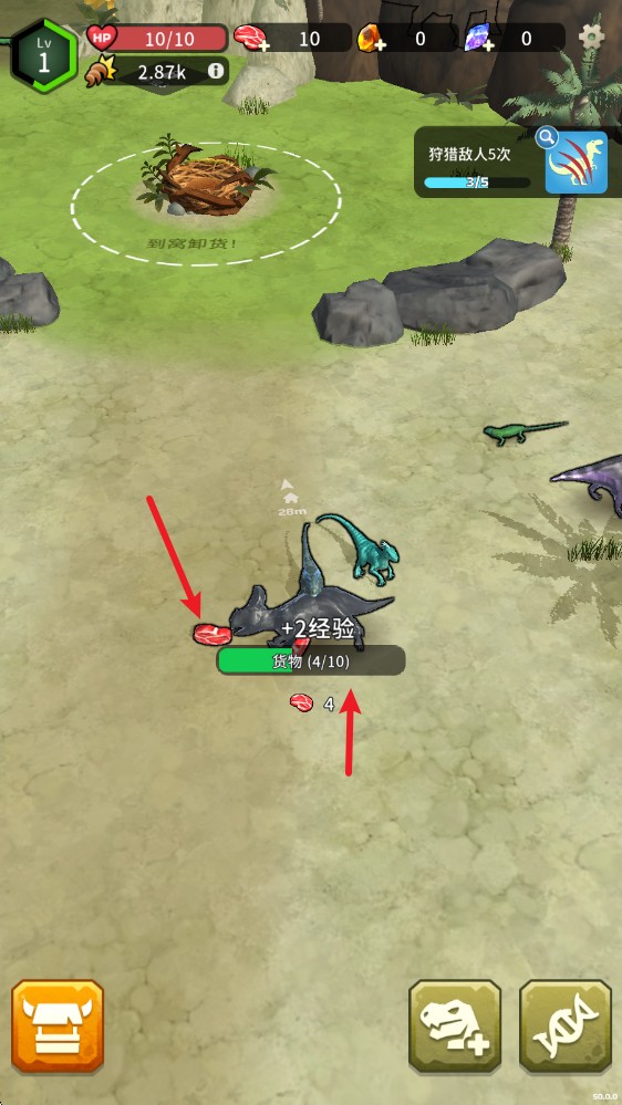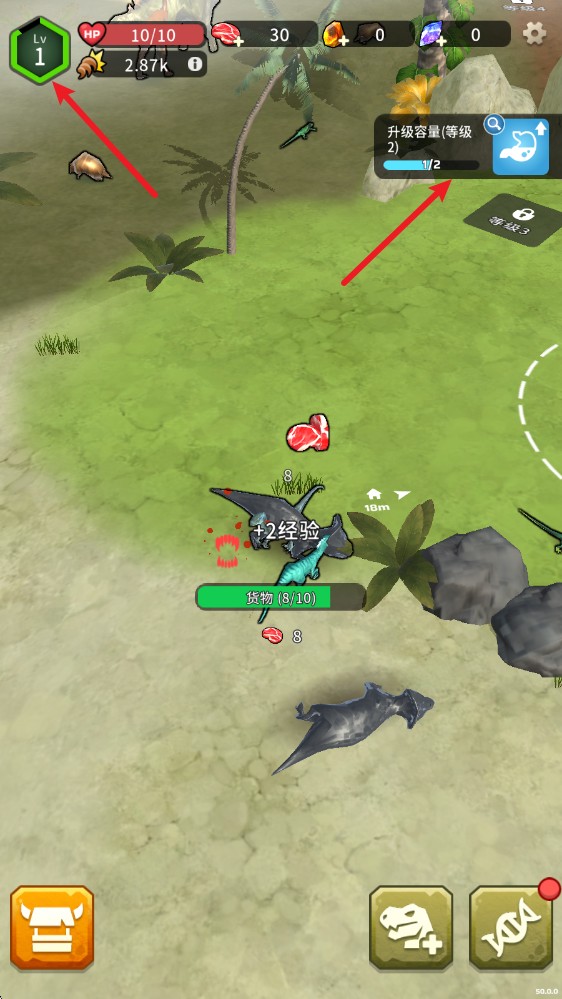3、击杀猎物之后就会掉落食物,靠近即可拾取,下方还会显示你的容量。