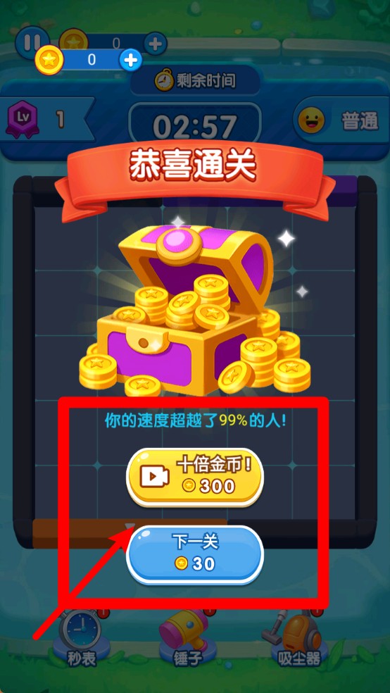 3. 通关福利:当你成功完成关卡,就能收获金币奖励。要是你想获取更多收益,点击“十倍金币”按钮,通过观看视频即可达成;当然,你也可以选择直接进入下一关卡,开启新的挑战。