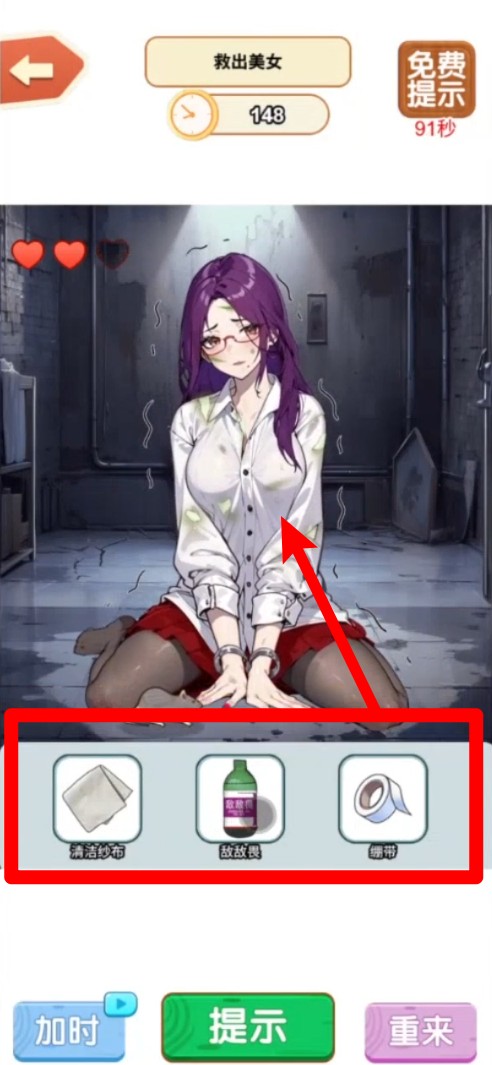 2.关卡挑战:根据提示选择正确工具进行操作,使用清洁布、胶带或救助药等道具,帮助角色顺利完成关卡任务。