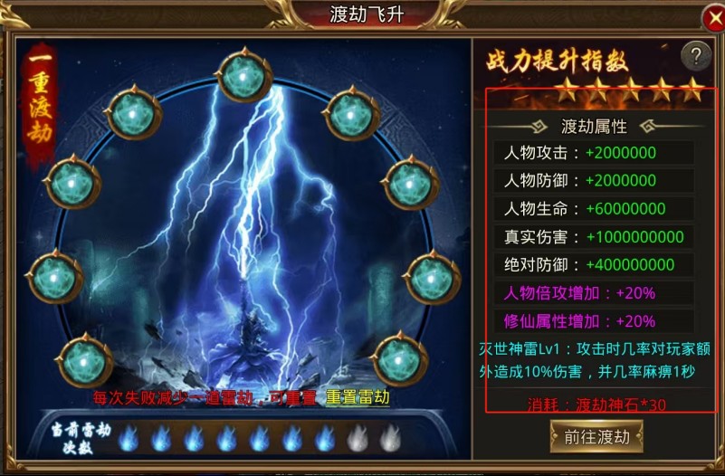 游戏内玩家可以通过渡劫飞升来提升人物属性,游戏共设置十重渡劫,每重渡劫需要经历九道雷劫,每渡劫失败一次,下次渡劫将减少一道雷劫。雷劫有十种不同类型,造成的伤害也不一样,每次玩家渡劫遭受的雷劫是随机的。
