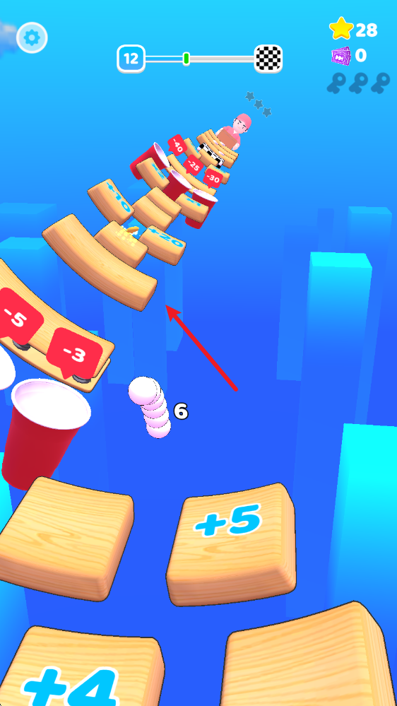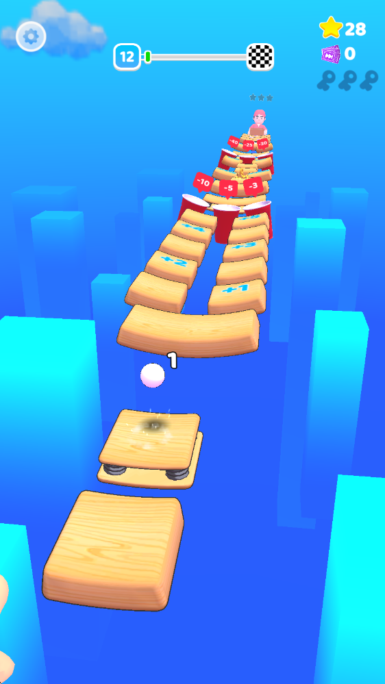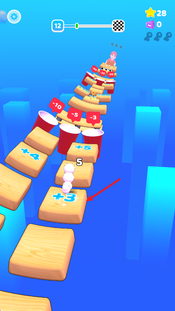 2、落到带有数字的木板上,就会根据上面显示的增加或者减少小球。