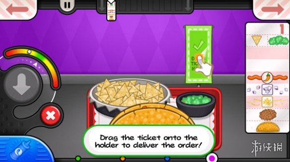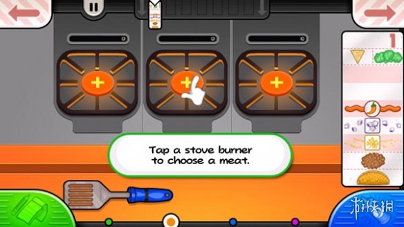 2、前往点餐站接收顾客的点单,随后转到烧烤站进行烹饪,将食物翻转并放置在玉米饼上。