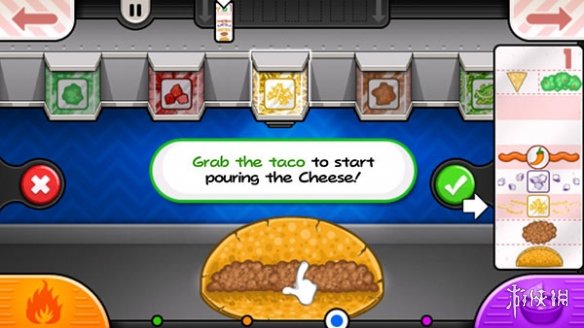 时间到后,将食材拖动到玉米饼中,然后点击蓝色按钮。