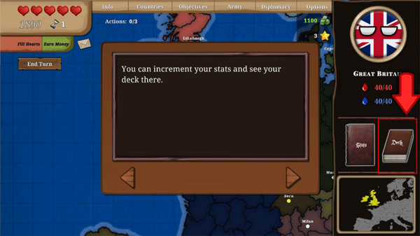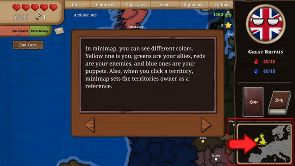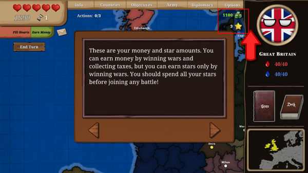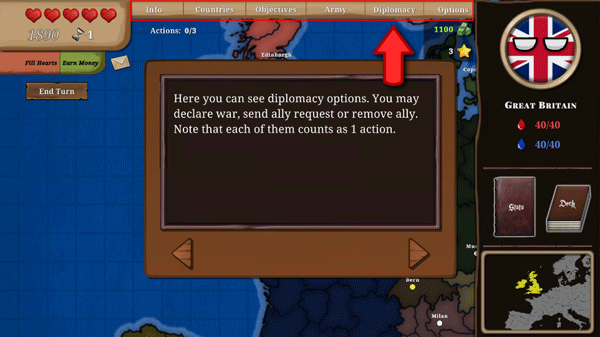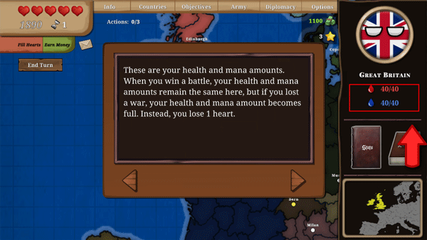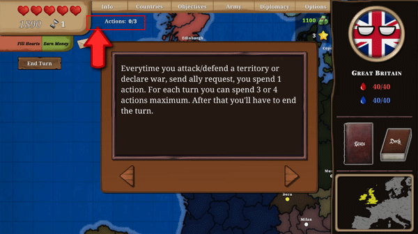 9、每当你进攻或防御一个领土,亦或是宣战,并发送盟友请求时,需花费1个行动。每个回合你最多可花费3或4个动作,之后必须结束该回合。当你结束一个回合,你的行动将被重置,同时其他国家会执行他们的行动。此外,每2个回合,你能填满1颗心。