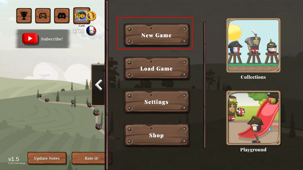 3、进入游戏系统主界面,在此界面你能看到自己持有的国家硬币以及显示全国的金额。利用国家硬币可解锁国家球,此外,向左滑动面板就能进入“playground”和“collections”。最后点击“New Game”开启游戏。