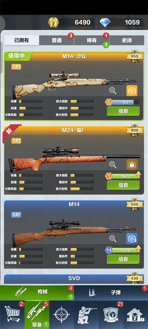 2、装备分为枪械和子弹界面,这里能够查看枪械和子弹的具体信息以及获取条件,后续的保养升级都在此处。